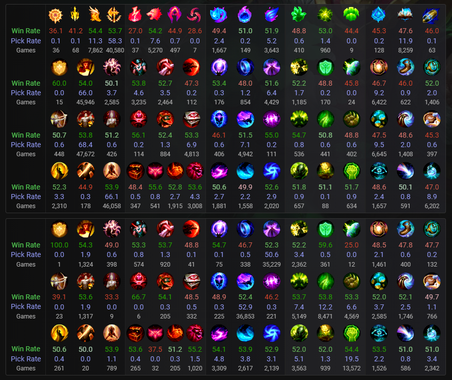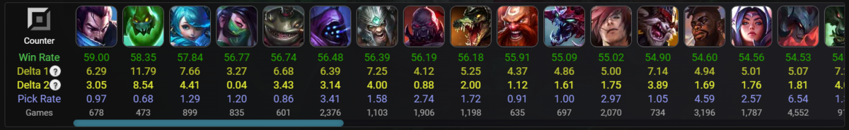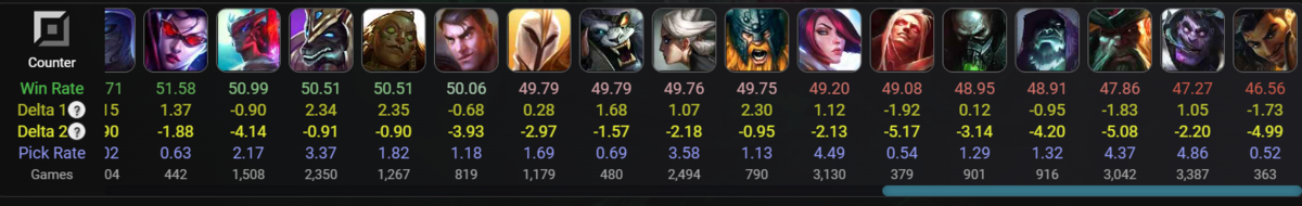 張り付いて殴るタイプにはとことん強いなという感じ。過度なスケーリングチャンプ相手でなければスケール勝ちできるのもポイント高い(Rのレベルスケール◎)。また、レーン強者相手にも逃げるorプロキシでいいのが勝率に出ているのだろうか。
