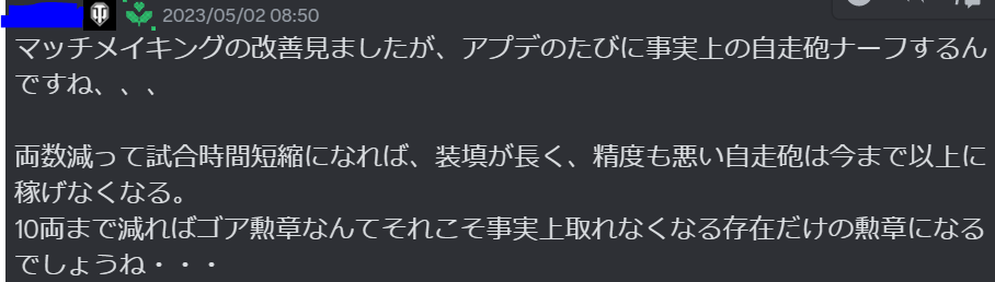おっといきなり自走砲に対する意見だ。自走砲なんていうこのゲームが栄えない理由1位みたいなやつのナーフが嫌な人なんて不思議だなあ。それともこの人にとってゴア勲章が取れなくて勲章集めができないことがそんなに嫌か?勲章集めなんて珍しい遊び方する人いるんだねえ~~~
