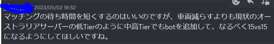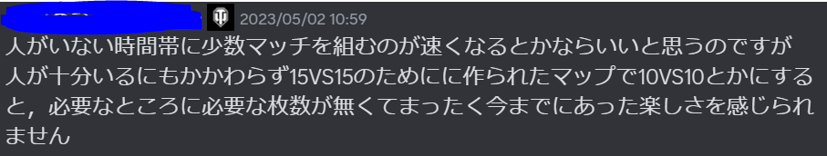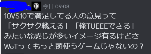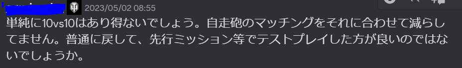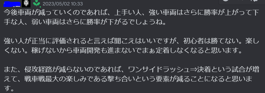 おことわり この記事は決して晒しが目的ではないため、WoT公式Discord鯖からの投稿を引用する際に投稿者名を隠させていただきますが、WoT公式鯖に参加している人であればDiscordの検索欄より投稿者を探すことができますことを念頭に置いていただけると幸いです。