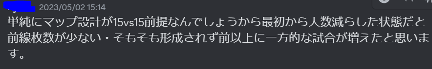 いきなりメインコンテンツの1つであるランダム戦の人数が変わるという大改変が入り、当たり前だがプレイヤーも大騒ぎした。そしてこのアプデと同時に公式discord鯖に設置されたご意見箱には賛否の意見及びお気持ち表明が投稿された。この記事でのターゲットはそれである。