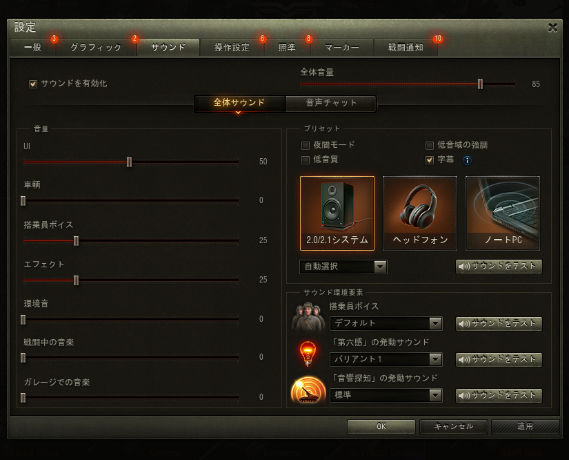 ゲーム内設定。乗員ボイスはデフォルト、第六感はバリアント1で音声が流れます。